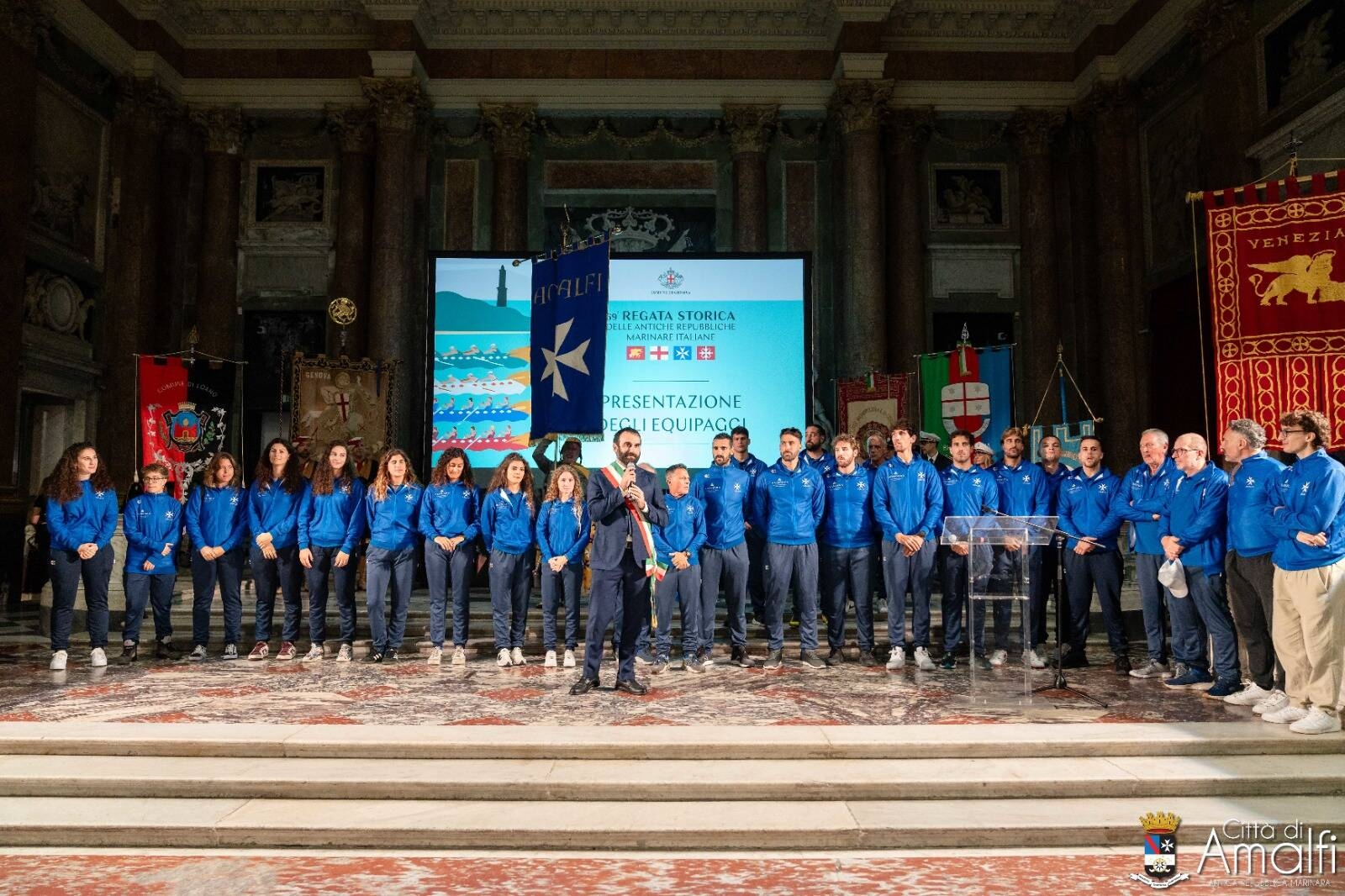 Agli ordini dell’allenatore Antonio La Padula, che è diventato nonno per la terza volta ed al quale è stato riservato un caloroso applauso, l’equipaggio composto da Luigi Lucibello (capovoga), Luca Parlato, Vincenzo Abbagnale, Giovanni Ruocco, Nunzio Di Colandrea, Giovanni Abagnale, Salvatore Monfrecola e Luigi Proto, oltre al timoniere Vincenzo di Palma, con le riserve Gabriele Amato e Giovanni Bottone, ha completato quest’oggi la preparazione in vista del palio in programma nel Canale di Calma di Prà. E questo pomeriggio hanno sfilato nel Salone del Maggior Consiglio presso il Palazzo Ducale, gremito come nelle grandi occasioni, presentandosi al pubblico tra gli applausi dei tanti tifosi amalfitani giunti a Genova per sostenere l’equipaggio azzurrocrociato.