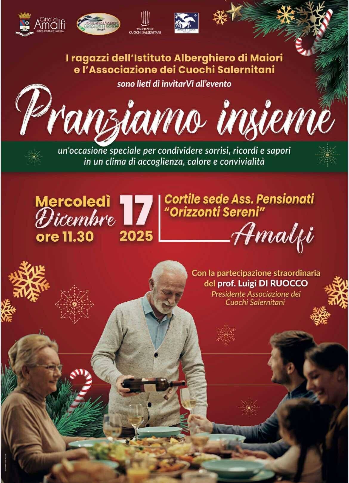 Chef in erba cucinano per gli anziani di Amalfi. Sono gli alunni dell’Istituto Alberghiero di Maiori che quest’anno prepareranno il consueto Pranzo di Natale organizzato dal Comune di Amalfi. Saranno loro, sotto la supervisione del professor Luigi di Ruocco, Presidente dell’Associazione Cuochi Salernitani, i protagonisti di questo evento che l'Amministrazione Comunale, guidata dal Sindaco Daniele Milano, organizza ogni anno per tutti gli anziani della Città. Oltre un centinaio gli ospiti attesi al Pranzo di Natale che si svolgerà mercoledì 17 dicembre 2025 (a partire dalle ore 11.30) nel cortile antistante l’ex sede dell’azienda per il turismo.
