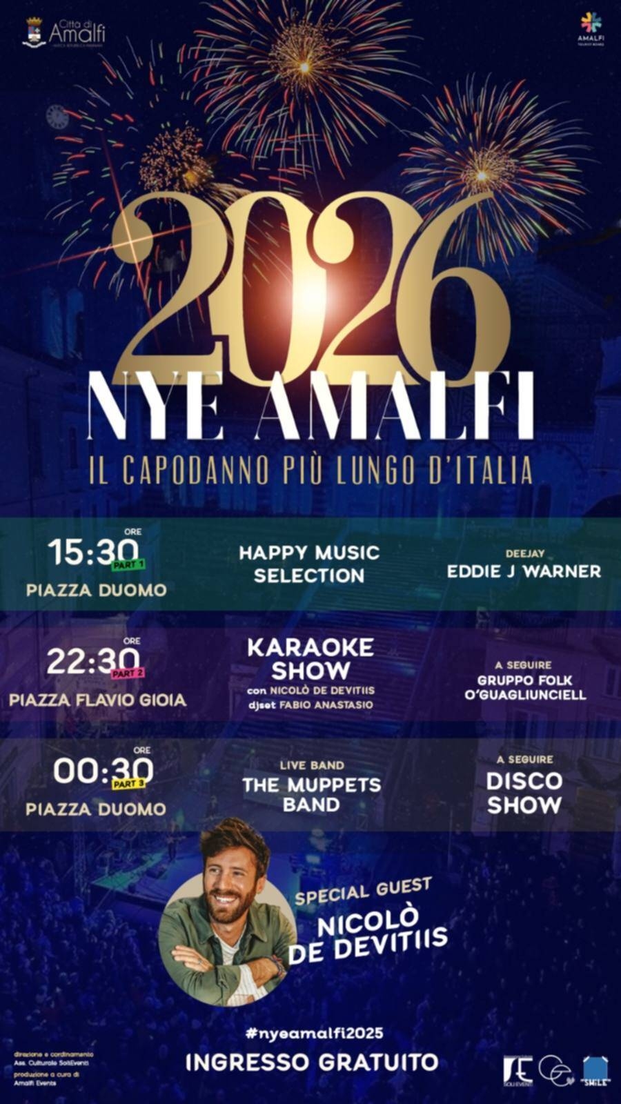 Sarà un Capodanno molto “happy” all’insegna dell'allegria: si parte dal pomeriggio, alle 15:30 del 31 dicembre con una selezione musicale che accompagnerà la golden hour. Dalle 22.30 ballerà in Piazza Flavio Gioia e Piazza Duomo con tanta musica live suonata dal vivo e un cast straordinario che si alternerà sui due palchi guidato da Nicolò De Divitiis, con dj personality, in un incrocio tra contemporaneità e recupero di suoni antichi della tradizione, con sperimentazioni e avanguardie artistiche che si contaminano con i gruppi folk. Il primo gennaio appuntamento con il concerto con l’orchestra sinfonica in Arsenale e di pomeriggio le sfilate e le esibizioni del Capodanno Folk Amalfitano.