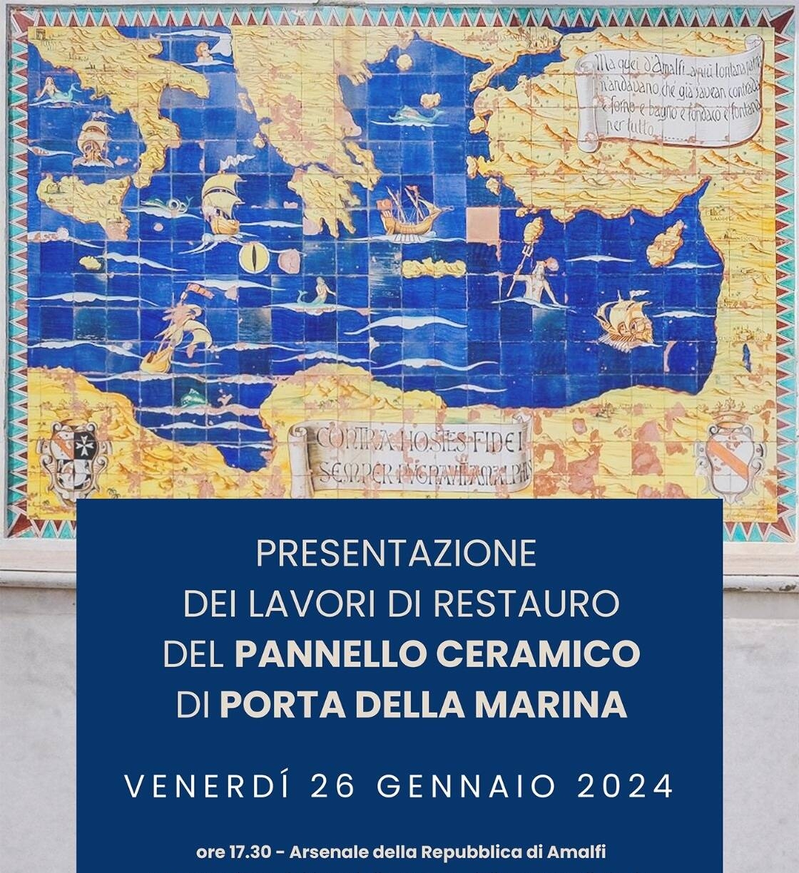 Il pannello ceramico della Porta della Marina, in cui è raffigurato il ruolo di crocevia di Amalfi tra Oriente e Occidente, ritorna al suo originario splendore dopo un importante intervento di restauro. L’opera del maestro Renato Rossi, uno dei padri fondatori dell’arte della maiolica in Costiera Amalfitana, sarà restituita alla Città in tutta la sua magnificenza venerdì 26 gennaio 2024 quando è in programma la cerimonia di scopertura fissata al termine della presentazione dei lavori di restauro (ore 17,30 presso l’Arsenale della Repubblica di Amalfi) che hanno interessato, nel corso degli ultimi anni, anche la statua di Flavio Gioia e le lapidi commemorative.