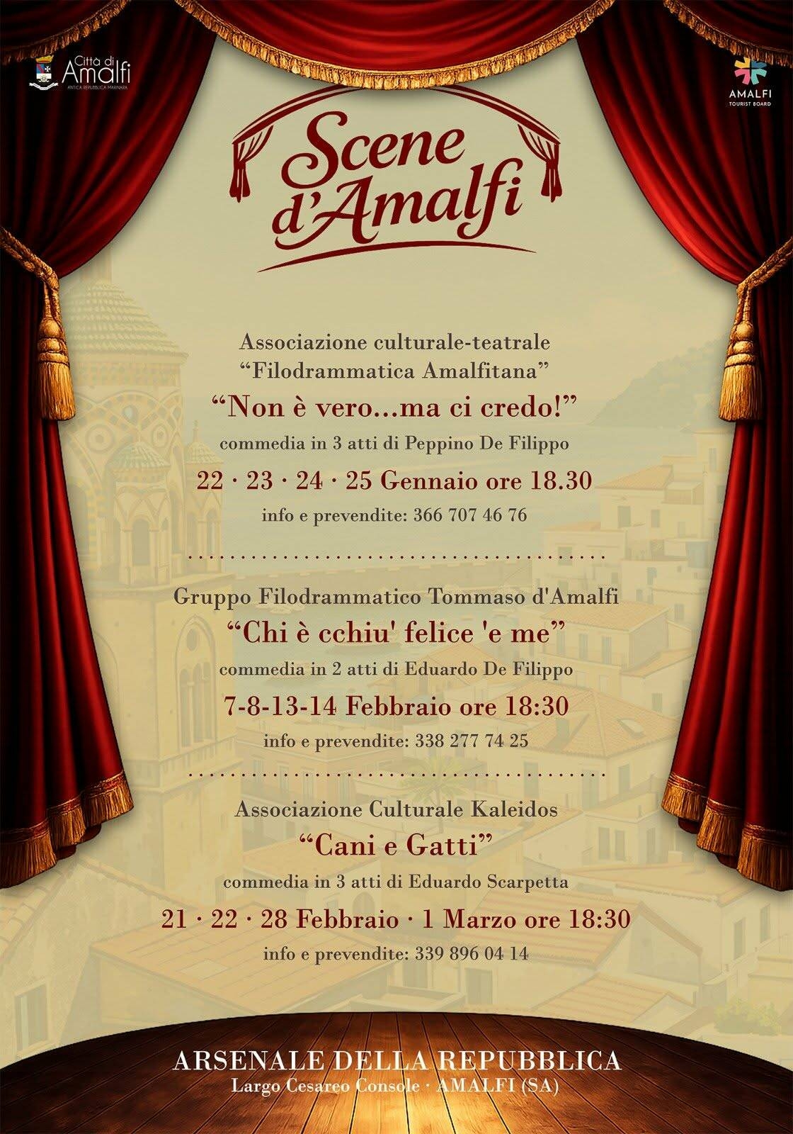 Si parte con l’associazione culturale-teatrale “Filodrammatica Amalfitana” con “Non è vero… ma ci credo!”, commedia in tre atti di Peppino De Filippo, in scena il 22, 23, 24 e 25 gennaio 2026 alle 18:30. Protagonista è Don Gervasio, che ha tante buone qualità, ma la mattina non si alza e si rimette a letto per scaramanzia, convinto che l'esito dei suoi affari dipenda più dal malocchio che da altro. Info e prevendite: 366 707 46 76. Ingresso 7 euro.