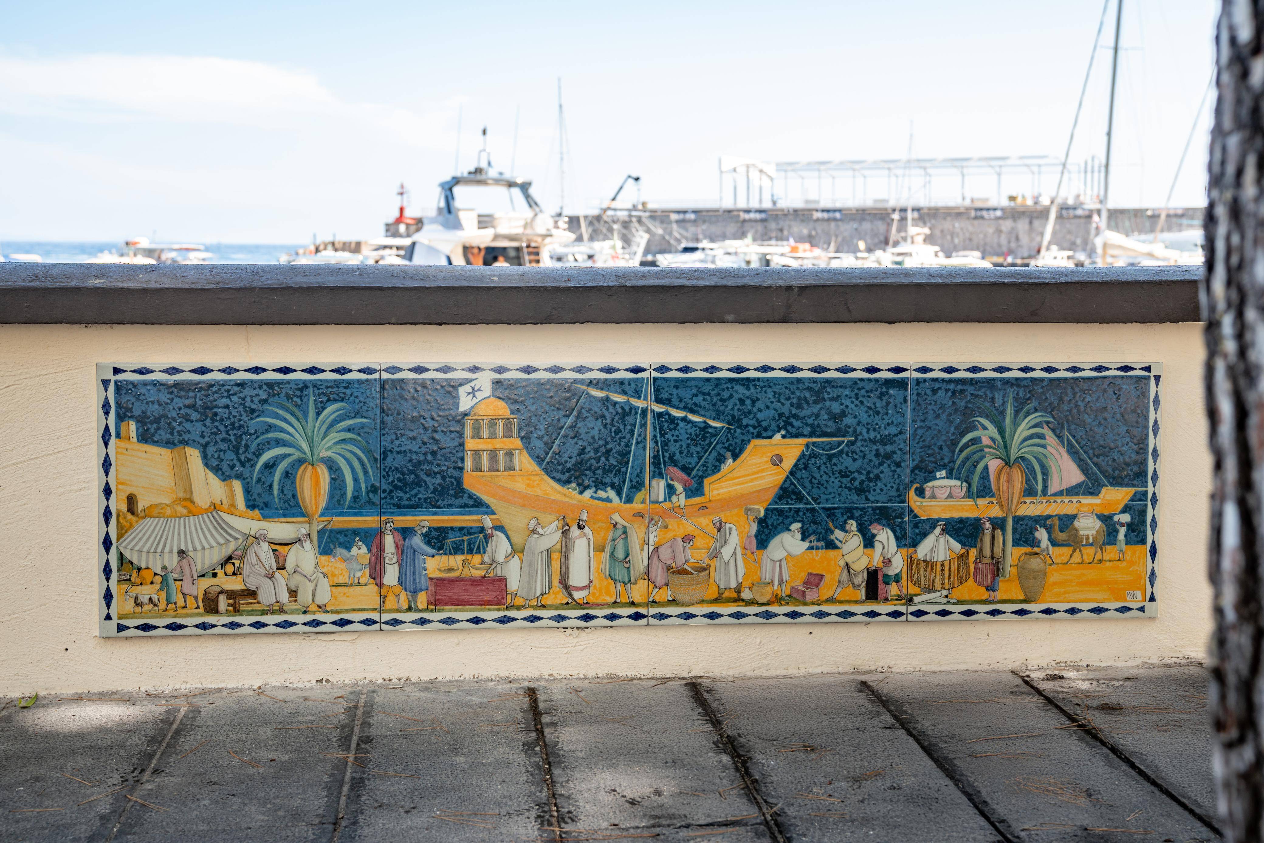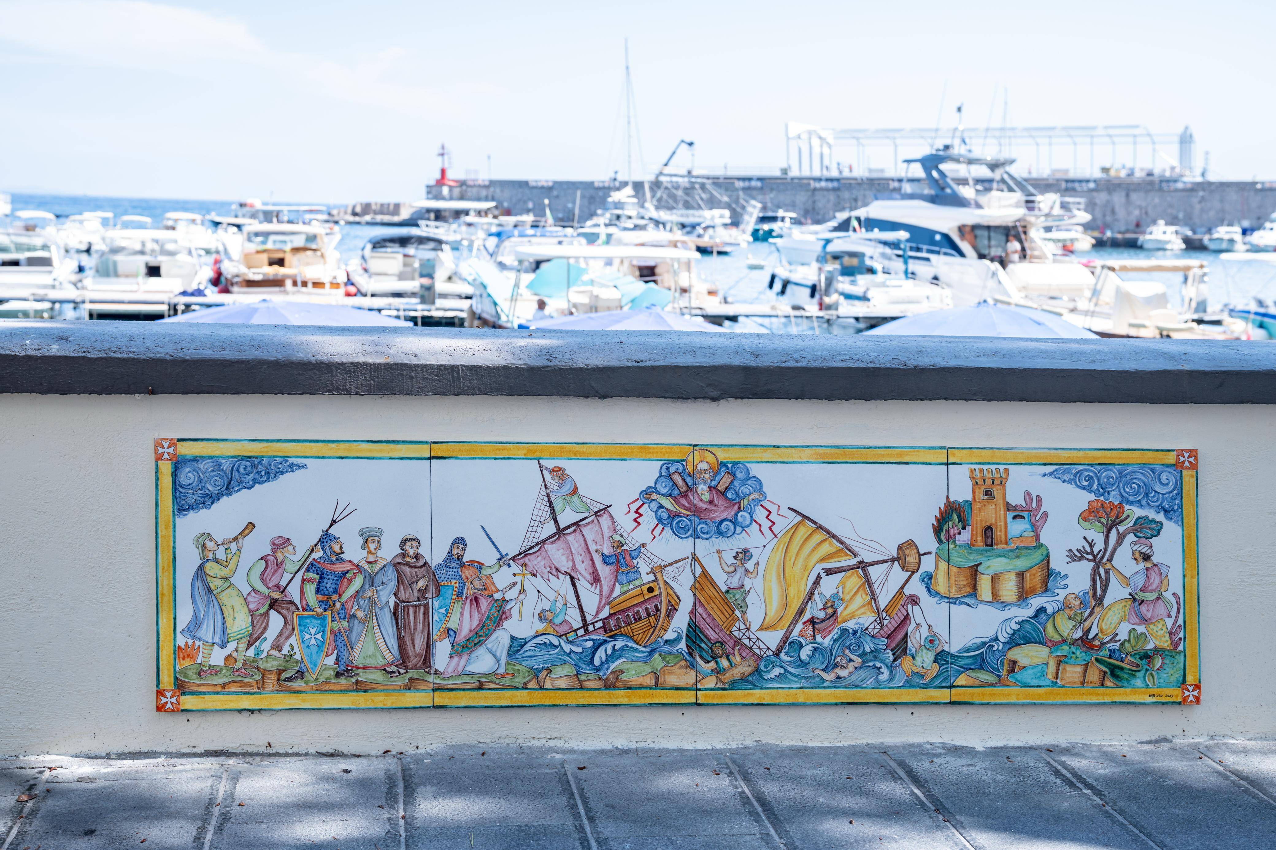 Torri grifagne poste a protezione dei tratti di costa dalle incursioni nemiche, mercanti che assistono alle operazioni di carico delle galee su cui viaggiavano spezie, stoffe e broccati. E poi ancora il miracolo di Sant’Andrea, che agitando il mare scacciò le navi del pirata saraceno Ariadeno Barbarossa, il mito delle sirene che qui tentarono di ammaliare Ulisse e quei volti di donne e di uomini nelle rotte tra Oriente ed Occidente.