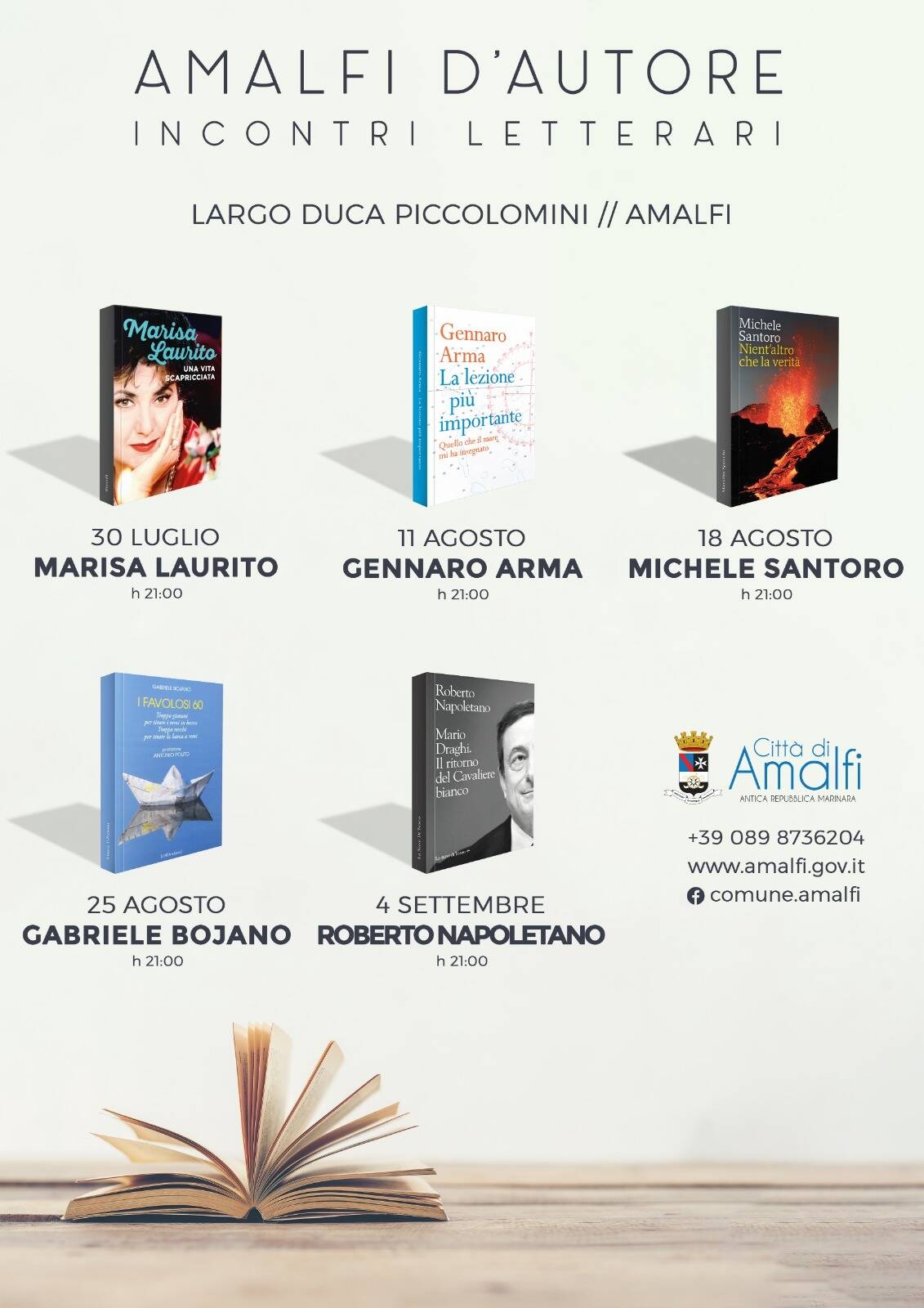 Ad inaugurare la rassegna, venerdì 30 luglio, alle ore 21.00, in Largo Duca Piccolomini - Amalfi, Marisa Laurito, autrice di “Una vita scapricciata” (Rizzoli) che insieme ad Alfonso Sarno ripercorrerà con l’ironia che la contraddistingue gli esordi, gli amori e le amicizie di una donna, un’artista poliedrica che vissuto molte vite.