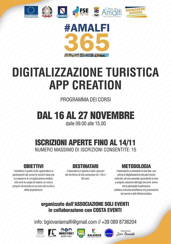 Al via l'ultimo laboratorio di #Amalfi365 Benessere Giovani, a cura del partner di progetto Associazione Culturale Soli Eventi. La prima lezione del corso Digitalizzazione Turistica App Creation è orientata a digitalizzare e rendere fruibili tutte le informazioni ai turisti che giungono in Costiera Amalfitana.