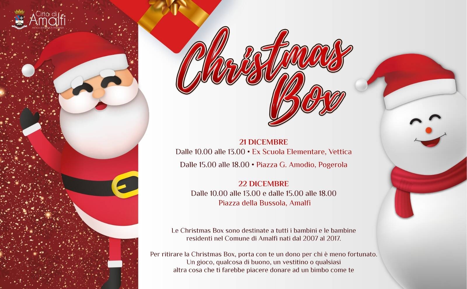 E' in consegna, in questi giorni, la Christmas Box Digitale, un pacco speciale pensato dall'Amministrazione Comunale di Amalfi guidata dal sindaco Daniele Milano.